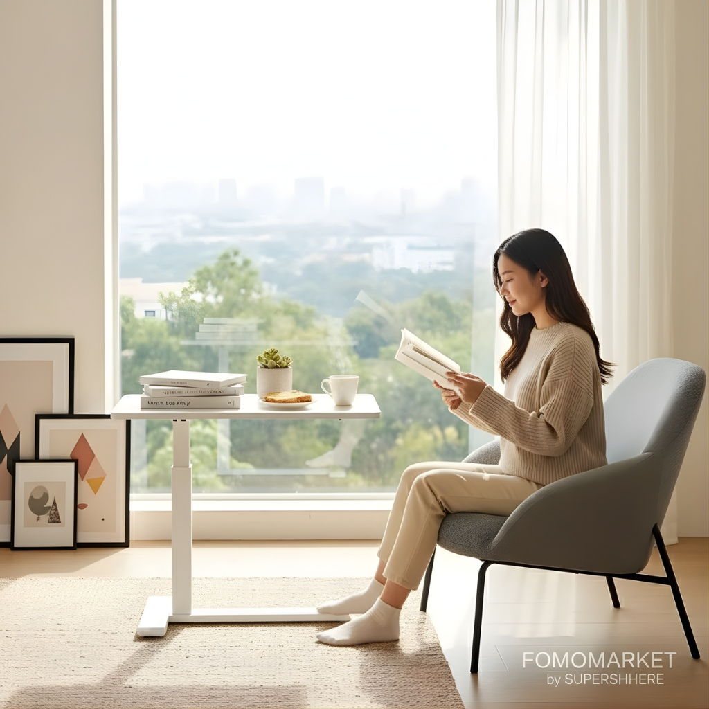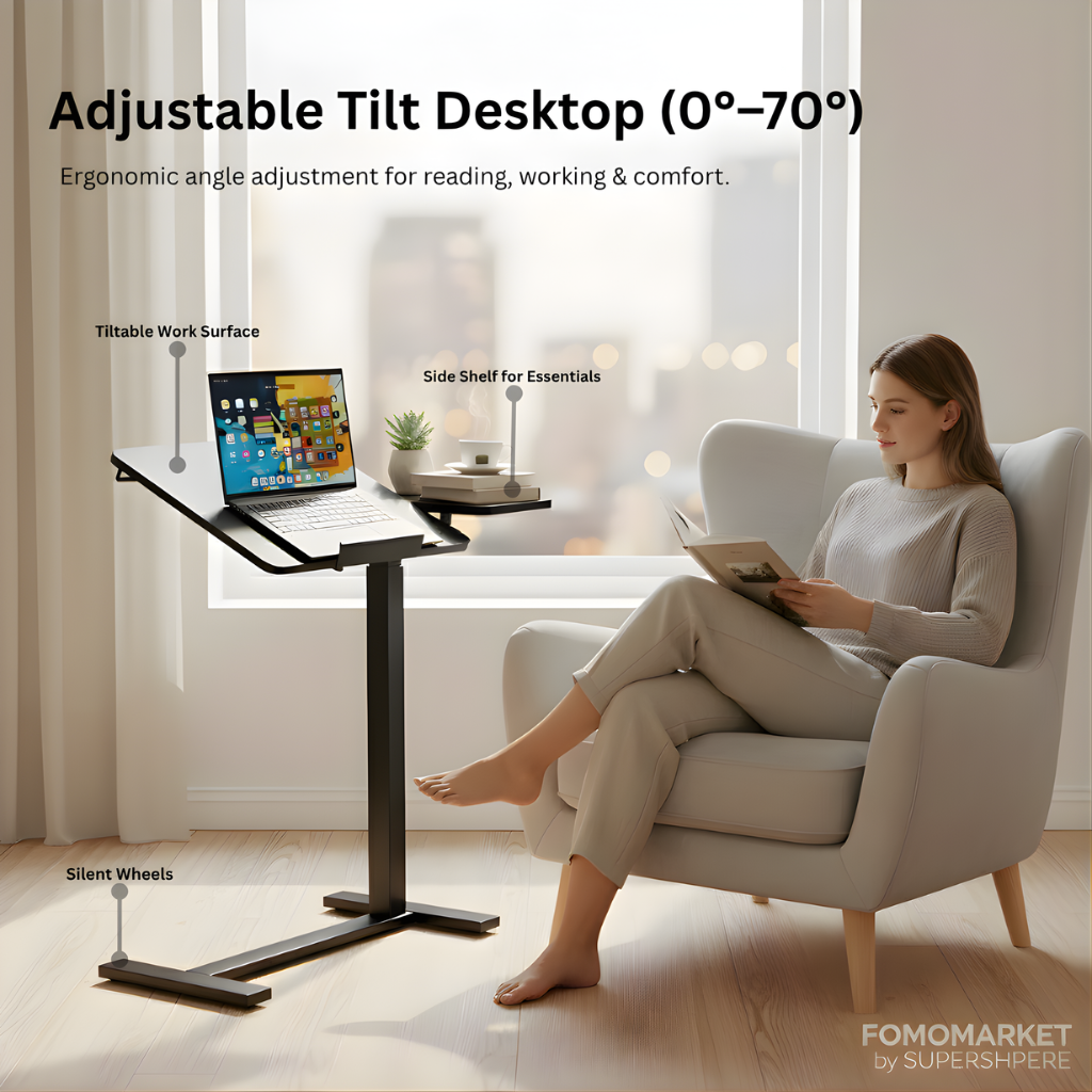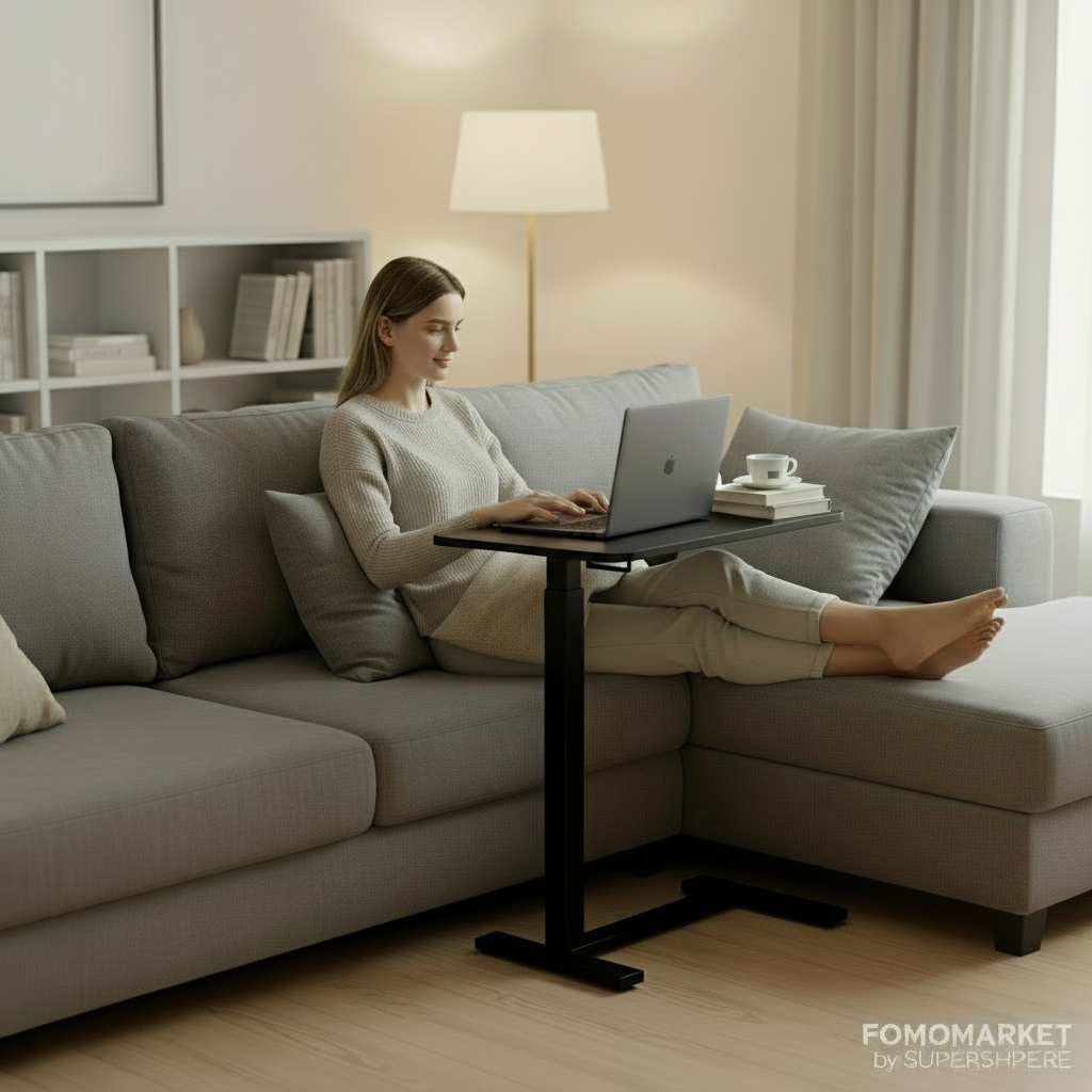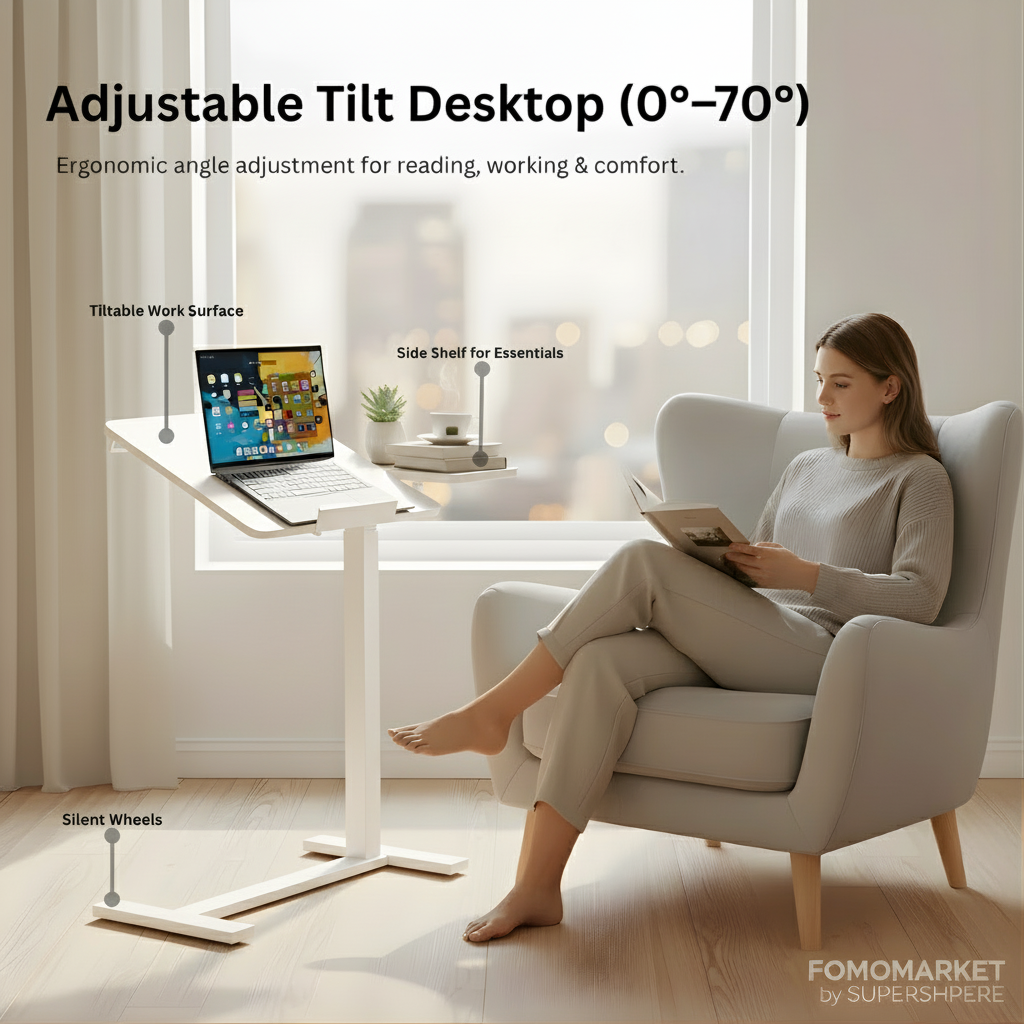 Transform any space into a functional workstation with this adjustable overbed desk that redefines comfort and convenience for modern living—so you can work, study, or relax wherever you are. The SlideUp™ Desk combines an ergonomic tilting desktop, smooth pneumatic height adjustment, premium stability, and effortless mobility. A low-profile H-base (≈ 3.5 cm / 1.38" clearance) slides neatly under beds, sofas, or couches without taking up space, while a stainless-steel safety latch keeps the top locked flat when you need it. Built with a reinforced metal frame to minimize wobble and warping, it’s made for daily work, study, recovery, and entertainment—and assembles quickly with clear instructions.